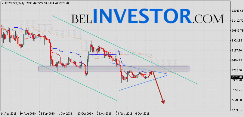 Таким образом, Курс Bitcoin прогноз на неделю 16 — 20 декабря 2019 предполагает попытку развития коррекции к уровня 7725. Откуда стоит ожидать отскок и продолжение падения криптовалюты с потенциальной целью вблизи уровня 5250. В пользу снижения выступит тест уровня сопротивления. Отменой варианта падения станет сильный рост и пробой области 9225. В этом случае стоит ожидать продолжения подъёма Bitcoin с потенциальной цель на уровне 9995.