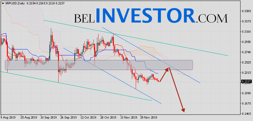 Криптовалюта Ripple завершает торговую неделю вблизи области 0.2137. Котировки XRP/USD торгуются ниже нижней границы Облака Ichimoku Kinko Hyo. Это указывает на наличие медвежьей тенденции по Ripple. В рамках прогноза курса цифровой валюты на торговую неделю 16 — 20 декабря 2019. Ожидается тест нижней границы Облака Ichimoku Kinko Hyo вблизи уровня 0.2325. Откуда стоит ожидать отскок и попытку продолжения падения криптовалюты с целью вблизи уровня 0.1465.