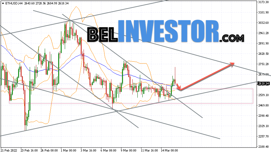 Ethereum ETH/USD торгуется на уровне 2618. Котировки криптовалюты торгуются выше уровня скользящей средней с периодом 55. Это указывает на наличие бычьей тенденции по Ethereum. На данный момент котировки криптовалюты движутся вблизи верхней границы полос индикатора Bollinger Bands. Ethereum ETH/USD прогноз на сегодня 17 марта 2022 В рамках прогноза курса Ethereum ожидается тест уровня 2600. Откуда стоит ожидать попытку продолжения роста ETH/USD и дальнейшего развития восходящей тенденции. Целью такого движения выступает область вблизи уровня 2760. Консервативная область для покупок Ethereum располагается вблизи нижней границы полос индикатора Bollinger Bands на уровне 2500. Отменой варианта продолжения роста курса Ethereum станет пробой области нижней границы полос индикатора Bollinger Bands. А также скользящей средней с периодом 55 и закрытие котировок пары ниже области 2480. Это укажет на смену текущей тенденции в пользу медвежьей по ETH/USD. В случае пробоя верхней границы полос индикатора Bollinger Bands стоит ожидать ускорения падения криптовалюты. Ethereum ETH/USD прогноз на сегодня 17 марта 2022 предполагает тест уровня 2600. Далее ожидается продолжение роста […]