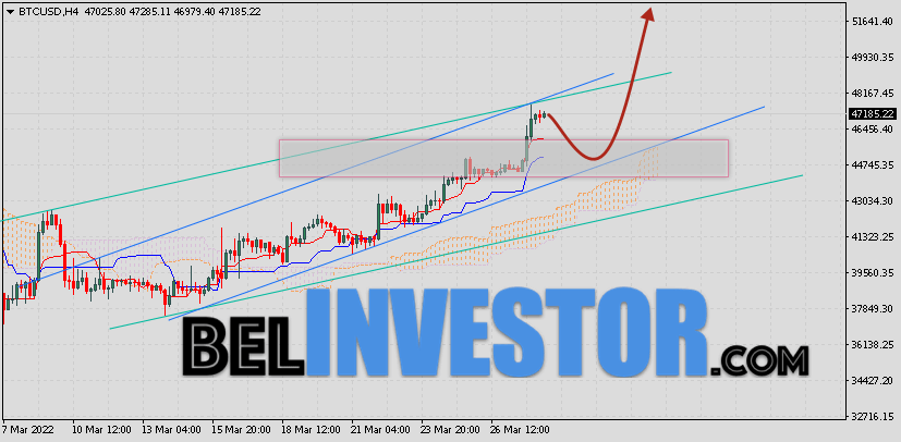 Криптовалюта Bitcoin торгуется на уровне 47185 продолжает движение в рамках роста и бычьего канала. Котировки BTC/USD продолжает движение выше верхней границы Облака индикатора Ichimoku Kinko Hyo. Это предполагает наличие краткосрочной бычьей тенденции по цифровому активу. В рамках прогноза курса Биткоина на 29 марта 2022 от belinvestor.com. Ожидается развитие нисходящей коррекции стоимости актива и тест сигнальных линий индикатора Ишимоку вблизи уровня 44805. Откуда стоит ожидать отскок и попытку продолжения подъёма криптовалюты Bitcoin с потенциальной целью на уровне 51805. Курс Bitcoin и прогноз BTC/USD на 29 марта 2022 Дополнительным сигналом в пользу роста криптовалюты BTC/USD выступит тест области поддержки. Вторым сигналом станет отскок от нижней границы бычьего канала. Ранее был получен сильный сигнал для покупок криптовалюты Bitcoin. Сигнал сформировался за счет пересечения сигнальных линий на уровне 41205. Ближайшая область сопротивления по BTC/USD на графике располагается на уровне 48105. Область поддержки по Bitcoin располагается на уровне 45055. Отменой такого варианта подъёма стоимости цифрового актива Bitcoin завтра станет падение и пробой нижней границы Облака […]