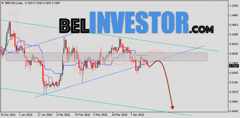 Криптовалюта Ripple завершает торговую неделю вблизи области 0.7247. Котировки XRP/USD торгуются ниже нижней границы Облака Ichimoku Kinko Hyo. Это указывает на наличие медвежьей тенденции по монете Ripple. В рамках прогноза курса цифровой валюты на торговую неделю 25 — 29 апреля 2022. Ожидается развитие коррекции и тест нижней границы Облака индикатора Ichimoku вблизи уровня 0.7425. Откуда стоит ожидать отскок вниз и попытку продолжения падения курса криптовалюты с целью вблизи уровня 0.4405. Курс XRP прогноз на 25 — 29 апреля 2022 Дополнительным сигналом в пользу падения криптовалюты выступит тест уровня сопротивления на графике цены. Вторым сигналом станет отскок от нижней границы бычьего канала, которая была пробита буквально несколько дней назад продавьцами монеты. Ранее был получен слабый сигнал для продаж криптовалюты Ripple. Сигнал сформировался за счет пересечения сигнальных линий на уровне 0.7475. Ближайшая область сопротивления по XRP располагается на уровне 0.7905. Области поддержки по XRP/USD располагается на уровне 0.6805. Отменой варианта падения котировок Ripple станет пробой верхней границы Облака Ichimoku Kinko Hyo с […]