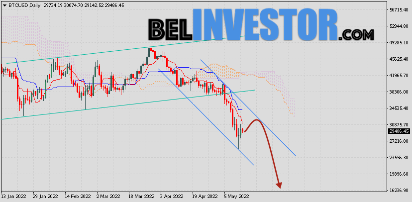 Криптовалюта Bitcoin завершает торговую неделю вблизи области 29486. Котировки BTC/USD торгуются ниже нижней Облака Ichimoku Kinko Hyo. Это указывает на среднесрочной медвежьей тенденции по Bitcoin. В рамках прогноза курса криптовалюты на неделю 16 — 20 мая 2022. Ожидается развитие коррекции и тест области сигнальных линий индикатора Ichimoku Kinko Hyo вблизи уровня 31055. Откуда стоит ожидать попытку отскока вниз и продолжения падения курса Биткоин к Доллару США с целью ниже уровня 16255. Курс Bitcoin прогноз на 16 — 20 мая 2022 Дополнительным сигналом в пользу падения ведущего цифрового актива на текущей торговой неделе выступит тест верхней границы медвежьего канала. Вторым сигналом станет отскок от области сопротивления на графике цены криптовалюты Биткоин. Ранее был получен слабый сигнал для продаж актива. Сигнал сформировался за счет пересечения сигнальных линий на уровне 43605. Ближайшая область сопротивления располагается на уровне 31055. Области поддержки по Bitcoin располагается на уровне 24605. Отменой варианта падения котировок Bitcoin станет пробой верхней границы Облака индикатора и закрытие цены выше уровня 44205. […]