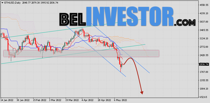 Криптовалюта Ethereum завершает торговую неделю вблизи области 2036. Котировки ETH/USD торгуются ниже нижней границы Облака Ichimoku Kinko Hyo. Это указывает на наличие медвежьей тенденции по Ethereum. В рамках прогноза курса цифрового актива на текущей неделе 16 — 20 мая 2022. Ожидается тест области сигнальных линий индикатора Ichimoku Kinko Hyo вблизи уровня 2245. Откуда стоит ожидать попытку отскока вниз и продолжение падения криптовалюты с целью на уровне 765. Ethereum прогноз курса на 16 — 20 мая 2022 Дополнительным сигналом в пользу падения криптовалюты выступит тест уровня сопротивления на графике монеты. Вторым сигналом станет отскок от верхней границы медвежьего канала. Ранее был получен слабый сигнал для продаж криптовалюты Ethereum. Сигнал сформировался за счет пересечения сигнальных линий на уровне 3005. Ближайшая область сопротивления располагается на уровне 2375. Области поддержки по ETH/USD располагается на уровне 1685. Отменой варианта падения стоимости Ethereum станет пробой верхней границы Облака Ichimoku Kinko Hyo с закрытием котировок выше области 3265. Это укажет на смену боковой тенденции в пользу бычьей […]