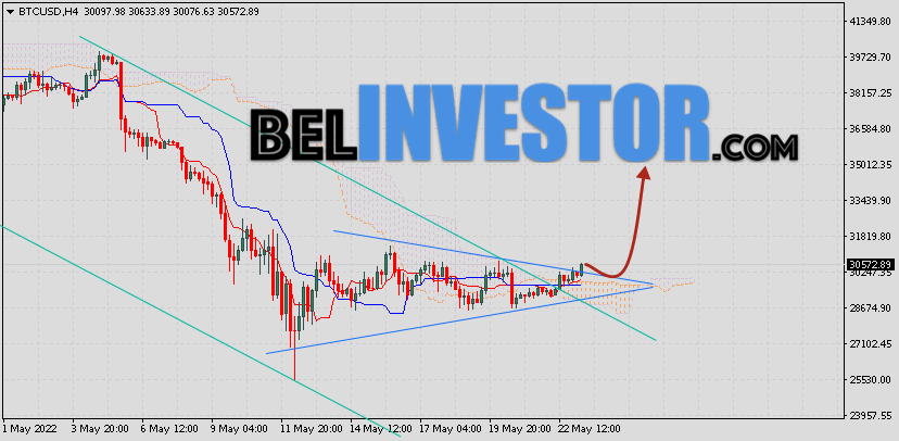 Криптовалюта Bitcoin торгуется на уровне 30572 продолжает движение в рамках роста и начала отработки модели ”Треугольник”. Котировки BTC/USD располагаются выше верхней границы Облака индикатора Ichimoku Kinko Hyo. Это предполагает наличие краткосрочной бычьей тенденции по цифровому активу. В рамках прогноза курса Биткоина на 24 мая 2022. Ожидается развитие небольшой коррекции стоимости актива и тест верхней границы Облака индикатора Ишимоку вблизи уровня 30245. Откуда стоит ожидать отскок и попытку продолжения роста криптовалюты Bitcoin с потенциальной целью на уровне 35015. Курс Bitcoin и прогноз BTC/USD на 24 мая 2022 Дополнительным сигналом в пользу подъёма криптовалюты BTC/USD выступит тест области поддержки. Вторым сигналом станет отскок от верхней границы модели ”Треугольник”. Ранее был получен слабый сигнал для покупок криптовалюты Bitcoin. Сигнал сформировался за счет пересечения сигнальных линий на уровне 29205. Ближайшая область сопротивления по BTC/USD на графике располагается на уровне 31805. Область поддержки по Bitcoin располагается на уровне 28675. Отменой такого варианта роста стоимости цифрового актива Bitcoin завтра станет падение и пробой нижней границы Облака […]