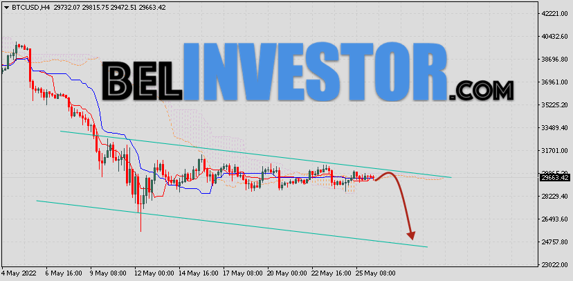Криптовалюта Bitcoin торгуется на уровне 29663 продолжает движение в рамках падения и медвежьего канала. Котировки BTC/USD располагаются ниже нижней границы Облака индикатора Ichimoku Kinko Hyo. Это предполагает наличие краткосрочной медвежьей тенденции по цифровому активу. В рамках прогноза курса Биткоина на 27 мая 2022. Ожидается развитие небольшой коррекции стоимости актива и тест нижней границы Облака индикатора Ишимоку вблизи уровня 30055. Откуда стоит ожидать отскок и попытку продолжения падения криптовалюты Bitcoin с потенциальной целью на уровне 24755. Курс Bitcoin и прогноз BTC/USD на 27 мая 2022 Дополнительным сигналом в пользу падения криптовалюты BTC/USD выступит тест области сопротивления. Вторым сигналом станет отскок от верхней границы нисходящего канала. Ранее был получен средней силы для продаж криптовалюты Bitcoin. Сигнал сформировался за счет пересечения сигнальных линий на уровне 29505. Ближайшая область сопротивления по BTC/USD на графике располагается на уровне 29805. Область поддержки по Bitcoin располагается на уровне 28205. Отменой такого варианта падения стоимости цифрового актива Bitcoin завтра станет сильный рост и пробой нижней границы Облака индикатора […]