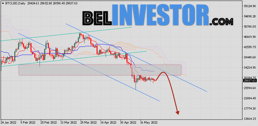 Криптовалюта Bitcoin завершает торговую неделю вблизи области 29037. Котировки BTC/USD торгуются ниже нижней Облака Ichimoku Kinko Hyo. Это указывает на среднесрочной медвежьей тенденции по Bitcoin. В рамках прогноза курса криптовалюты на неделю 30 мая — 3 июня 2022. Ожидается развитие коррекции и тест области сигнальных линий индикатора Ichimoku Kinko Hyo вблизи уровня 30405. Откуда стоит ожидать попытку отскока вниз и продолжения падения курса Биткоин к Доллару США с целью ниже уровня 17105. Курс Bitcoin прогноз на 30 мая — 3 июня 2022 Дополнительным сигналом в пользу падения ведущего цифрового актива на текущей торговой неделе выступит тест верхней границы медвежьего канала. Вторым сигналом станет отскок от области сопротивления на графике цены криптовалюты Биткоин. Ранее был получен слабый сигнал для продаж актива. Сигнал сформировался за счет пересечения сигнальных линий на уровне 43605. Ближайшая область сопротивления На графике Биткоина располагается на уровне 32005. Области поддержки по Bitcoin располагается на уровне 25905. Отменой варианта падения котировок Bitcoin станет пробой верхней границы Облака индикатора и […]