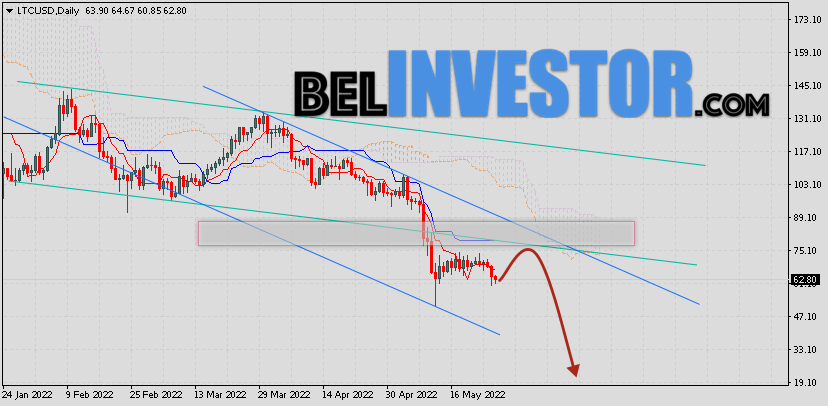 Криптовалюта Litecoin завершает торговую неделю вблизи области 62. Котировки LTC/USD торгуются ниже нижней границы Облака Ichimoku Kinko Hyo. Это указывает на наличие медвежьей тенденции по Litecoin. В рамках прогноза курса криптовалюты на следующую неделю 30 мая — 3 июня 2022. Ожидается попытка развития коррекции цены и тест области сигнальных линий индикатора Ишимоку вблизи уровня 75. Откуда стоит ожидать отскок вниз и попытку продолжения падения LTC/USD с потенциальной целью ниже уровня 20. Курс Litecoin прогноз на 30 мая — 3 июня 2022 Дополнительным сигналом в пользу падения криптовалюты выступит тест уровня сопротивления на графике актива. Вторым сигналом станет отскок от верхней границы нисходящего канала. Ранее был получен слабый сигнал для продаж криптовалюты Litecoin. Сигнал сформировался за счет пересечения сигнальных линий на уровне 110. Ближайшая область сопротивления по Litecoin располагается на уровне 80. Области поддержки по LTC/USD располагается на уровне 55. Отменой варианта падения Litecoin станет пробой верхней границы Облака Ichimoku Kinko Hyo с закрытием котировок выше области 105. Это укажет на […]