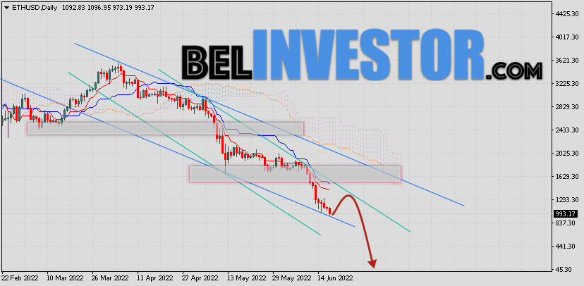 Криптовалюта Ethereum завершает торговую неделю вблизи области 993. Котировки ETH/USD торгуются ниже нижней границы Облака Ichimoku Kinko Hyo. Это указывает на наличие медвежьей тенденции по Ethereum. В рамках прогноза курса цифрового актива на текущей неделе 20 — 24 июня 2022. Ожидается тест области сигнальных линий индикатора Ichimoku Kinko Hyo вблизи уровня 1235. Откуда стоит ожидать попытку отскока вниз и продолжение падения криптовалюты с целью на уровне 105. Ethereum прогноз курса на 20 — 24 июня 2022 Дополнительным сигналом в пользу падения криптовалюты выступит тест уровня сопротивления на графике монеты. Вторым сигналом станет отскок от верхней границы медвежьего канала. Ранее был получен слабый сигнал для продаж криптовалюты Ethereum. Сигнал сформировался за счет пересечения сигнальных линий на уровне 3005. Ближайшая область сопротивления располагается на уровне 1625. Области поддержки по ETH/USD располагается на уровне 805. Отменой варианта падения стоимости Ethereum станет пробой верхней границы Облака Ichimoku Kinko Hyo с закрытием котировок выше области 2655. Это укажет на смену боковой тенденции в пользу бычьей […]