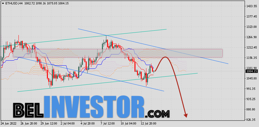 Криптовалюта Ethereum торгуется на уровне 1084 и продолжает движение в рамках коррекции и медвежьего канала. Котировки ETH/USD движутся ниже нижней границы Облака Ichimoku Kinko Hyo. Это указывает на наличие медвежьей тенденции по Ethereum. В рамках прогноза курса Эфириум на 15 июля 2022. Ожидается развитие рост цифрового актива и тест нижней границы Облака Ichimoku Kinko Hyo вблизи уровня 1145. Откуда стоит ожидать отскок и попытку продолжения падения ETH/USD с целью ниже уровня 825. ETH/USD прогноз и курс Ethereum на 15 июля 2022 Дополнительным сигналом в пользу падения криптовалюты выступит тест уровня сопротивления на графике цены. Вторым сигналом станет отскок от верхней границы медвежьего канала. Ранее был получен слабый сигнал для продаж криптовалюты Ethereum. Сигнал сформировался за счет пересечения сигнальных линий на уровне 1185. Ближайшая область сопротивления по Ethereum располагается на уровне 1175. Область поддержки ETH/USD располагается на уровне 985. Отменой варианта снижения стоимости криптовалюты Ethereum станет сильный рост и пробой верхней границы Облака индикатора Ишимоку с закрытием цены над уровнем 1255. […]
