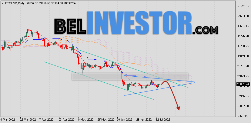 Криптовалюта Bitcoin завершает торговую неделю вблизи области 20832. Котировки BTC/USD торгуются ниже нижней Облака Ichimoku Kinko Hyo. Это указывает на среднесрочной медвежьей тенденции по Bitcoin. В рамках прогноза курса криптовалюты на неделю 18 — 22 июля 2022. Ожидается развитие коррекции и тест нижней границы Облака индикатора Ichimoku Kinko Hyo вблизи уровня 21455. Откуда стоит ожидать попытку отскока вниз и продолжения падения курса Биткоин к Доллару США с целью ниже уровня 9055. Курс Bitcoin прогноз на 18 — 22 июля 2022 Дополнительным сигналом в пользу падения ведущего цифрового актива на текущей торговой неделе выступит тест верхней границы медвежьего канала. Вторым сигналом станет отскок от области сопротивления на графике цены криптовалюты Биткоин. Ранее был получен слабый сигнал для покупок актива. Сигнал сформировался за счет пересечения сигнальных линий на уровне 20655. Ближайшая область сопротивления На графике Биткоина располагается на уровне 24825. Области поддержки по Bitcoin располагается на уровне 15055. Отменой варианта падения котировок Bitcoin станет пробой верхней границы Облака индикатора и закрытие цены […]