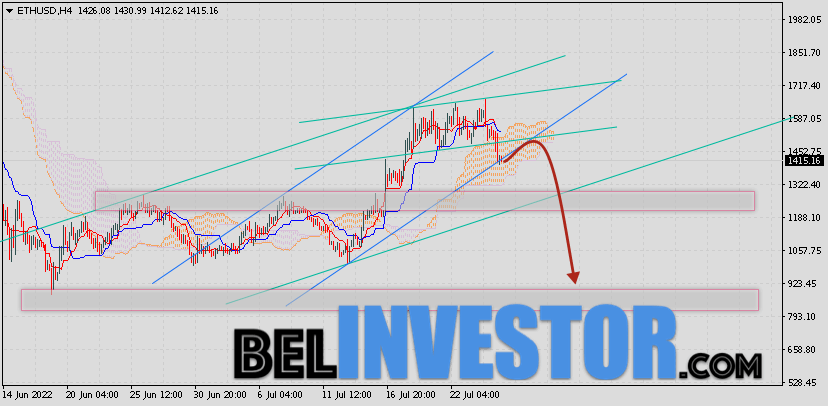 Криптовалюта Ethereum торгуется на уровне 1415 и продолжает движение в рамках коррекции и бычьего канала. Котировки ETH/USD движутся внутри Облака Ichimoku Kinko Hyo. Это указывает на наличие боковой тенденции по Ethereum. В рамках прогноза курса Эфириум на 27 июля 2022. Ожидается развитие коррекции цифрового актива и тест верхней границы Облака Ichimoku Kinko Hyo вблизи уровня 1455. Откуда стоит ожидать отскок и попытку продолжения падения ETH/USD с целью ниже уровня 925. ETH/USD прогноз и курс Ethereum на 27 июля 2022 Дополнительным сигналом в пользу падения криптовалюты выступит тест уровня сопротивления на графике цены. Вторым сигналом станет отскок от нижней границы бычьего канала, который был пробит вниз. Ранее был получен слабый сигнал для продаж криптовалюты Ethereum. Сигнал сформировался за счет пересечения сигнальных линий на уровне 1565. Ближайшая область сопротивления по Ethereum располагается на уровне 1645. Область поддержки ETH/USD располагается на уровне 1305. Отменой варианта роста стоимости криптовалюты Ethereum станет падение и пробой нижней границы Облака индикатора Ишимоку с закрытием цены под уровнем […]