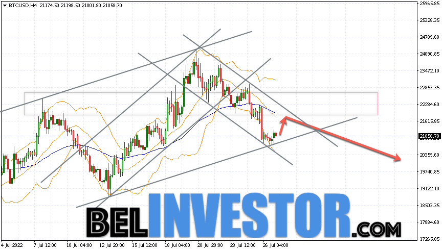Bitcoin BTC/USD торгуется на уровне 21058. Котировки криптовалюты торгуются ниже уровня скользящей средней с периодом 55. Это указывает на наличие медвежьей тенденции по Bitcoin. На данный момент котировки криптовалюты движутся вблизи нижней границы полос индикатора Bollinger Bands. Bitcoin BTC/USD прогноз на сегодня 28 июля 2022 В рамках прогноза курса Bitcoin ожидается тест уровня 21760. Откуда стоит ожидать попытку продолжения падения BTC/USD и дальнейшего развития нисходящей тенденции. Целью такого движения выступает область вблизи уровня 20160. Консервативная область для продаж Bitcoin располагается вблизи верхней границы полос индикатора Bollinger Bands на уровне 23100. Отменой варианта продолжения снижения курса Bitcoin станет пробой области верхней границы полос индикатора Bollinger Bands. А также скользящей средней с периодом 55 и закрытие котировок пары выше области 23250. Это укажет на смену текущей тенденции в пользу бычьей по BTC/USD. В случае пробоя нижней границы полос индикатора Bollinger Bands стоит ожидать ускорения падения криптовалюты. Bitcoin BTC/USD прогноз на сегодня 28 июля 2022 предполагает тест уровня 21760. Далее ожидается продолжение падения […]