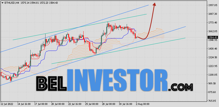 Криптовалюта Ethereum торгуется на уровне 1584 и продолжает движение в рамках коррекции и бычьего канала. Котировки ETH/USD движутся внутри Облака Ichimoku Kinko Hyo. Это указывает на наличие боковой тенденции по Ethereum. В рамках прогноза курса Эфириум на 3 августа 2022. Ожидается развитие коррекции цифрового актива и тест нижней границы Облака Ichimoku Kinko Hyo вблизи уровня 1555. Откуда стоит ожидать отскок и попытку продолжения роста ETH/USD с целью выше уровня 2035. ETH/USD прогноз и курс Ethereum на 3 августа 2022 Дополнительным сигналом в пользу подъёма криптовалюты выступит тест уровня поддержки на графике цены. Вторым сигналом станет отскок от нижней границы бычьего канала. Ранее был получен слабый сигнал для продаж криптовалюты Ethereum. Сигнал сформировался за счет пересечения сигнальных линий на уровне 1685. Ближайшая область сопротивления по Ethereum располагается на уровне 1775. Область поддержки ETH/USD располагается на уровне 1325. Отменой варианта роста стоимости криптовалюты Ethereum станет падение и пробой нижней границы Облака индикатора Ишимоку с закрытием цены под уровнем 1375. Такой сценарий укажет […]
