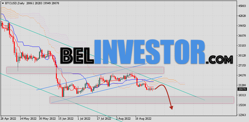Криптовалюта Bitcoin завершает торговую неделю вблизи области 20078. Котировки BTC/USD торгуются ниже нижней границы Облака Ichimoku Kinko Hyo. Это указывает на среднесрочной медвежьей тенденции по Bitcoin. В рамках прогноза курса криптовалюты на неделю 5 — 9 сентября 2022. Ожидается развитие бычьей коррекции и тест нижней границы Облака индикатора Ichimoku Kinko Hyo вблизи уровня 21305. Откуда стоит ожидать попытку отскока вниз и продолжения падения курса Биткоин к Доллару США с целью ниже уровня 13505. Курс Bitcoin прогноз на 5 — 9 сентября 2022 Дополнительным сигналом в пользу снижения ведущего цифрового актива на текущей торговой неделе выступит тест верхней границы нисходящего канала. Вторым сигналом станет отскок от области сопротивления на графике цены криптовалюты Биткоин. Ранее был получен сигнал средней силы для продаж актива. Сигнал сформировался за счет пересечения сигнальных линий на уровне 20765. Ближайшая область сопротивления на графике Биткоина располагается на уровне 24705. Области поддержки по Bitcoin располагается на уровне 18355. Отменой варианта падения котировок Bitcoin станет пробой верхней границы Облака индикатора […]
