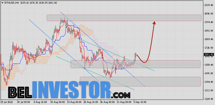 Криптовалюта Ethereum торгуется на уровне 1661 и продолжает движение в рамках коррекции и покинули переделы нисходящего канала. Котировки ETH/USD движутся выше верхней границы Облака Ichimoku Kinko Hyo. Это указывает на наличие бычьей тенденции по Ethereum. В рамках прогноза курса Эфириум на 7 сентября 2022. Ожидается развитие коррекции цифрового актива и тест верхней границы Облака Ichimoku Kinko Hyo вблизи уровня 1585. Откуда стоит ожидать отскок и попытку продолжения роста ETH/USD с целью выше уровня 1975. ETH/USD прогноз и курс Ethereum на 7 сентября 2022 Дополнительным сигналом в пользу падения криптовалюты выступит тест уровня сопротивления на графике цены. Вторым сигналом станет отскок от верхней границы нисходящего канала. Ранее был получен сильный сигнал для продаж криптовалюты Ethereum. Сигнал сформировался за счет пересечения сигнальных линий на уровне 1555. Ближайшая область сопротивления по Ethereum располагается на уровне 1725. Область поддержки ETH/USD располагается на уровне 155. Отменой варианта роста стоимости криптовалюты Ethereum станет падение и пробой нижней границы Облака индикатора Ишимоку с закрытием цены под уровнем […]