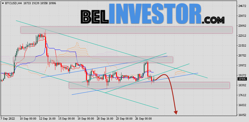 Криптовалюта Bitcoin торгуется на уровне 18906 продолжает движение в рамках падения и бычьего канала. Котировки BTC/USD располагаются ниже нижней границы Облака индикатора Ichimoku Kinko Hyo. Это предполагает наличие краткосрочной бычьей тенденции по цифровому активу. В рамках прогноза курса Биткоина на 29 сентября 2022. Ожидается развитие коррекции стоимости актива и тест верхней границы Облака индикатора Ишимоку вблизи уровня 19175. Откуда стоит ожидать отскок и попытку продолжения падения криптовалюты Bitcoin с потенциальной целью на уровне 16055. Курс Bitcoin и прогноз BTC/USD на 29 сентября 2022 Дополнительным сигналом в пользу падения криптовалюты BTC/USD выступит тест области сопротивления на графике цены монеты. Вторым сигналом станет отскок от нижней границы бычьего канала. Ранее был получен слабый сигнал для продаж криптовалюты Bitcoin. Сигнал сформировался за счет пересечения сигнальных линий на уровне 19205. Ближайшая область сопротивления по BTC/USD на графике располагается на уровне 20205. Область поддержки по Bitcoin располагается на уровне 18395. Отменой такого варианта снижения стоимости цифрового актива Bitcoin завтра станет сильный рост и пробой верхней […]