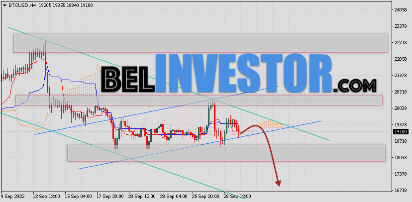 Криптовалюта Bitcoin торгуется на уровне 19100 продолжает движение в рамках падения и коррекции канала. Котировки BTC/USD располагаются внутри Облака индикатора Ichimoku Kinko Hyo. Это предполагает наличие краткосрочной боковой тенденции по цифровому активу. В рамках прогноза курса Биткоина на 30 сентября 2022. Ожидается развитие коррекции стоимости актива и тест верхней границы Облака индикатора Ишимоку вблизи уровня 19175. Откуда стоит ожидать отскок и попытку продолжения падения криптовалюты Bitcoin с потенциальной целью на уровне 16605. Курс Bitcoin и прогноз BTC/USD на 30 сентября 2022 Дополнительным сигналом в пользу падения криптовалюты BTC/USD выступит тест области сопротивления на графике цены монеты. Вторым сигналом станет отскок от верхней границы нисходящего канала. Ранее был получен слабый сигнал для продаж криптовалюты Bitcoin. Сигнал сформировался за счет пересечения сигнальных линий на уровне 19205. Ближайшая область сопротивления по BTC/USD на графике располагается на уровне 20205. Область поддержки по Bitcoin располагается на уровне 18005. Отменой такого варианта снижения стоимости цифрового актива Bitcoin завтра станет сильный рост и пробой верхней границы Облака […]