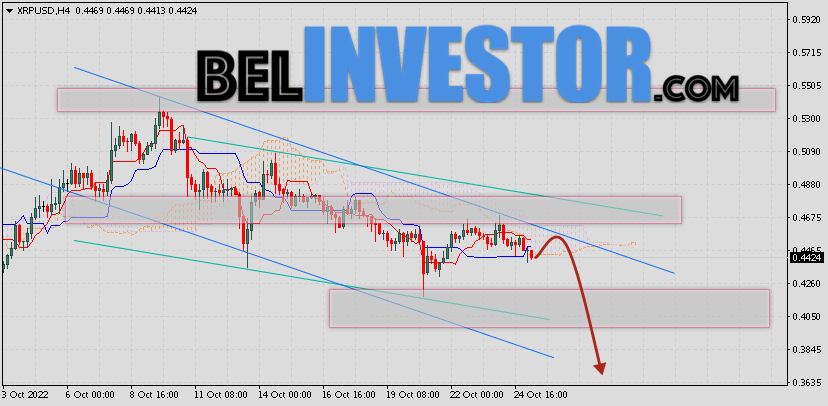 Криптовалюта Ripple торгуется на уровне 0.4424 продолжает движение в рамках падения и нисходящего канала. Котировки XRP/USD движутся ниже нижней границы Облака Ichimoku Kinko Hyo. Это указывает на наличие медвежьей тенденции по Ripple. В рамках прогноза курса цифровой валюты на 26 октября 2022. Ожидается развитие коррекции актива и тест верхней границы Облака индикатора Ichimoku Kinko Hyo вблизи уровня 0.4565. Откуда стоит ожидать отскок цены вниз и попытку продолжения падения стоимости криптовалюты XRP с потенциальной целью вблизи уровня 0.3645. Ripple прогноз и аналитика XRP/USD на 26 октября 2022 Дополнительным сигналом в пользу снижения криптовалюты XRP/USD выступит тест области сопротивления на графике цены криптовалюты. Вторым сигналом станет отскок от верхней границы нисходящего канала. Ранее был получен слабый сигнал для покупок криптовалюты Ripple. Сигнал сформировался за счет пересечения сигнальных линий на уровне 0.4395. Ближайшая область сопротивления по Ripple располагается на уровне 0.4675. Область поддержки по XRP/USD располагается на уровне 0.4055. Отменой варианта снижения криптовалюты Ripple в рамках прогноза на завтра станет сильный рост котировок […]