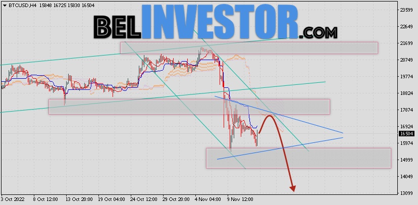 Криптовалюта Bitcoin торгуется на уровне 16504 продолжает движение в рамках падения и нисходящего канала. Котировки BTC/USD располагаются ниже нижней границы Облака индикатора Ichimoku Kinko Hyo. Это предполагает наличие краткосрочной медвежьей тенденции по цифровому активу. В рамках прогноза курса Биткоина на 15 ноября 2022. Ожидается развитие коррекции стоимости актива и тест нижней границы Облака индикатора Ишимоку вблизи уровня 17055. Откуда стоит ожидать отскок вниз и попытку продолжения падения криптовалюты Bitcoin с потенциальной целью на уровне 12855. Курс Bitcoin и прогноз BTC/USD на 15 ноября 2022 Дополнительным сигналом в пользу падения криптовалюты BTC/USD выступит тест области сопротивления на графике цены монеты. Вторым сигналом станет отскок от верхней границы модели ”Треугольник”. Ранее был получен слабый сигнал для продаж криптовалюты Bitcoin. Сигнал сформировался за счет пересечения сигнальных линий на уровне 20705. Ближайшая область сопротивления по BTC/USD на графике располагается на уровне 17875. Область поддержки по Bitcoin располагается на уровне 15005. Отменой такого варианта подъёма стоимости цифрового актива Bitcoin завтра станет сильный рост и пробой […]