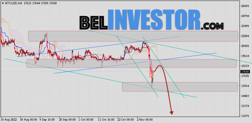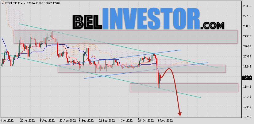 Криптовалюта Bitcoin торгуется на уровне 17608 продолжает движение в рамках падения и нисходящего канала. Котировки BTC/USD располагаются ниже нижней границы Облака индикатора Ichimoku Kinko Hyo. Это предполагает наличие краткосрочной медвежьей тенденции по цифровому активу. В рамках прогноза курса Биткоина на 11 ноября 2022. Ожидается развитие коррекции стоимости актива и тест нижней границы Облака индикатора Ишимоку вблизи уровня 18285. Откуда стоит ожидать отскок вниз и попытку продолжения падения криптовалюты Bitcoin с потенциальной целью на уровне 11905. Курс Bitcoin и прогноз BTC/USD на 11 ноября 2022 Дополнительным сигналом в пользу падения криптовалюты BTC/USD выступит тест области сопротивления на графике цены монеты. Вторым сигналом станет отскок от верхней границы нисходящего канала. Ранее был получен слабый сигнал для продаж криптовалюты Bitcoin. Сигнал сформировался за счет пересечения сигнальных линий на уровне 20705. Ближайшая область сопротивления по BTC/USD на графике располагается на уровне 18320. Область поддержки по Bitcoin располагается на уровне 15765. Отменой такого варианта подъёма стоимости цифрового актива Bitcoin завтра станет сильный рост и пробой […]
