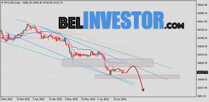 Криптовалюта Bitcoin завершает торговую неделю вблизи области 19112. Котировки BTC/USD торгуются ниже нижней Облака Ichimoku Kinko Hyo. Это указывает на среднесрочной медвежьей тенденции по Bitcoin. В рамках прогноза курса криптовалюты на неделю 4 — 8 июля 2022. Ожидается развитие коррекции и тест области сигнальных линий индикатора Ichimoku Kinko Hyo вблизи уровня 20405. Откуда стоит ожидать попытку отскока вниз и продолжения падения курса Биткоин к Доллару США с целью ниже уровня 9405. Курс Bitcoin прогноз на 4 — 8 июля 2022 Дополнительным сигналом в пользу падения ведущего цифро