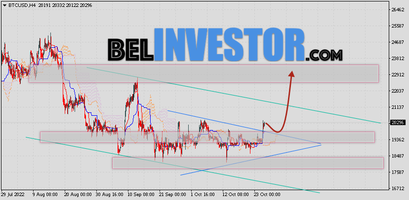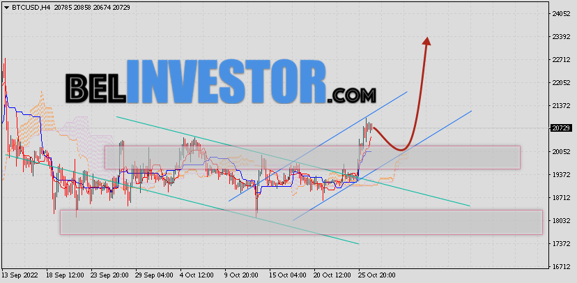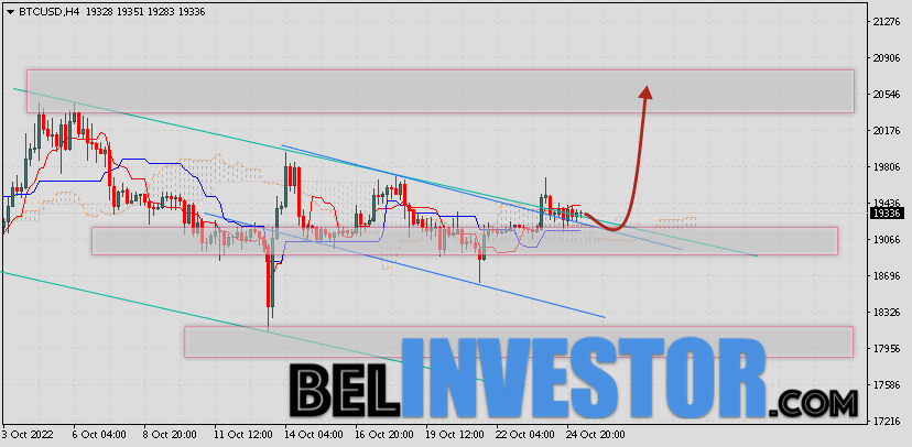 Криптовалюта Bitcoin торгуется на уровне 19336 продолжает движение в рамках коррекции и покинули пределы нисходящего канала. Котировки BTC/USD располагаются выше верхней границы Облака индикатора Ichimoku Kinko Hyo. Это предполагает наличие краткосрочной бычьей тенденции по цифровому активу. В рамках прогноза курса Биткоина на 26 октября 2022. Ожидается развитие коррекции стоимости актива и тест верхней границы Облака индикатора Ишимоку вблизи уровня 19085. Откуда стоит ожидать отскок и попытку продолжения роста криптовалюты Bitcoin с потенциальной целью на ур