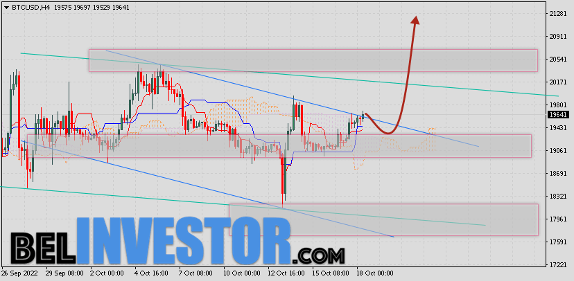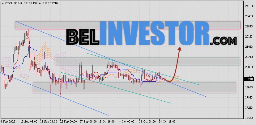 Криптовалюта Bitcoin торгуется на уровне 19137 продолжает движение в рамках коррекции и покинули пределы нисходящего канала. Котировки BTC/USD располагаются выше верхней границы Облака индикатора Ichimoku Kinko Hyo. Это предполагает наличие краткосрочной бычьей тенденции по цифровому активу. В рамках прогноза курса Биткоина на 21 октября 2022. Ожидается развитие коррекции стоимости актива и тест нижней границы Облака индикатора Ишимоку вблизи уровня 19085. Откуда стоит ожидать отскок и попытку продолжения роста криптовалюты Bitcoin с потенциальной целью на уро