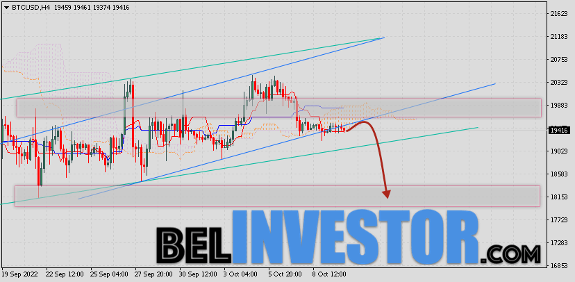 Криптовалюта Bitcoin торгуется на уровне 19416 продолжает движение в рамках коррекции и покинула пределы бычьего канала. Котировки BTC/USD располагаются ниже нижней границы Облака индикатора Ichimoku Kinko Hyo. Это предполагает наличие краткосрочной медвежьей тенденции по цифровому активу. В рамках прогноза курса Биткоина на 11 октября 2022. Ожидается развитие коррекции стоимости актива и тест нижней границы Облака индикатора Ишимоку вблизи уровня 19705. Откуда стоит ожидать отскок и попытку продолжения падения криптовалюты Bitcoin с потенциальной целью на уро