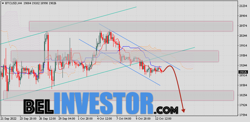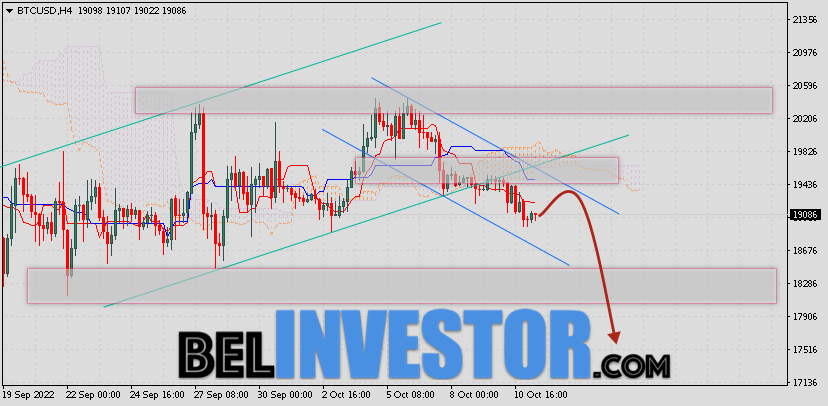 Криптовалюта Bitcoin торгуется на уровне 19026 продолжает движение в рамках коррекции и покинули пределы бычьего канала коррекции. Котировки BTC/USD располагаются ниже нижней границы Облака индикатора Ichimoku Kinko Hyo. Это предполагает наличие краткосрочной медвежьей тенденции по цифровому активу. В рамках прогноза курса Биткоина на 14 октября 2022. Ожидается развитие коррекции стоимости актива и тест области сигнальных линий индикатора Ишимоку вблизи уровня 19245. Откуда стоит ожидать отскок и попытку продолжения падения криптовалюты Bitcoin с потенциально