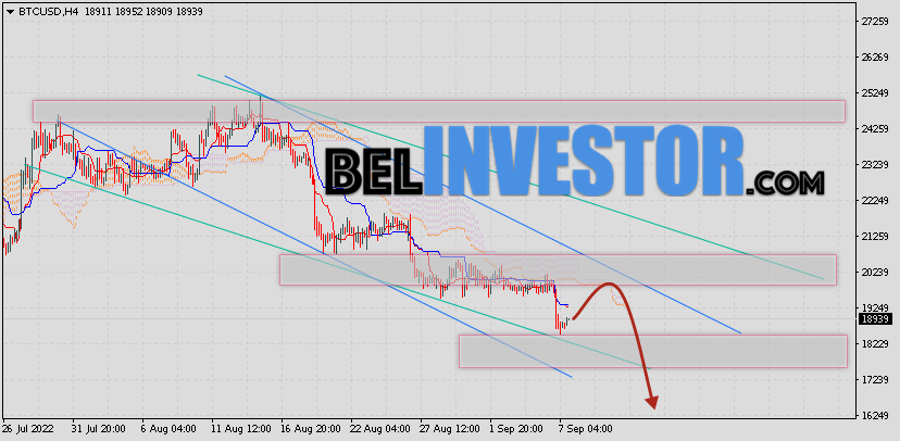 Криптовалюта Bitcoin торгуется на уровне 19129 продолжает движение в рамках падения и нисходящего канала. Котировки BTC/USD располагаются ниже нижней границы Облака индикатора Ichimoku Kinko Hyo. Это предполагает наличие краткосрочной медвежьей тенденции по цифровому активу. В рамках прогноза курса Биткоина на 9 сентября 2022. Ожидается развитие коррекции стоимости актива и тест нижней границы Облака индикатора Ишимоку вблизи уровня 19605. Откуда стоит ожидать отскок и попытку продолжения падения криптовалюты Bitcoin с потенциальной целью на уровне 16685. Курс Bitc