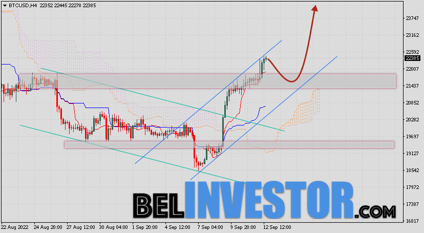 Криптовалюта Bitcoin торгуется на уровне 22385 продолжает движение в рамках роста и бычьего канала. Котировки BTC/USD располагаются выше верхней границы Облака индикатора Ichimoku Kinko Hyo. Это предполагает наличие краткосрочной бычьей тенденции по цифровому активу. В рамках прогноза курса Биткоина на 13 сентября 2022. Ожидается развитие коррекции стоимости актива и тест области сигнальных линий индикатора Ишимоку вблизи уровня 21455. Откуда стоит ожидать отскок и попытку продолжения роста криптовалюты Bitcoin с потенциальной целью на уровне 24255. Курс Bitcoin и про