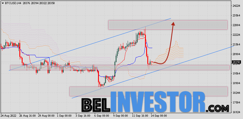 Криптовалюта Bitcoin торгуется на уровне 20143 продолжает движение в рамках падения и покинули пределы бычьего канала. Котировки BTC/USD располагаются ниже нижней границы Облака индикатора Ichimoku Kinko Hyo. Это предполагает наличие краткосрочной медвежьей тенденции по цифровому активу. В рамках прогноза курса Биткоина на 16 сентября 2022. Ожидается развитие коррекции стоимости актива и тест нижней границы Облака индикатора Ишимоку вблизи уровня 20265. Откуда стоит ожидать отскок и попытку продолжения падения криптовалюты Bitcoin с потенциальной целью на уров