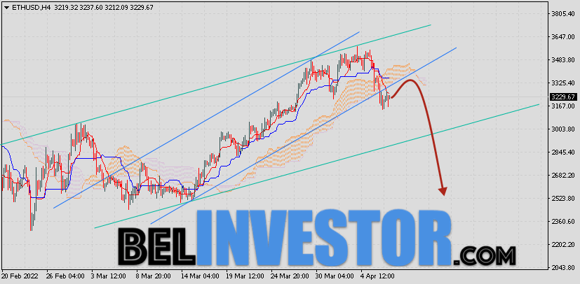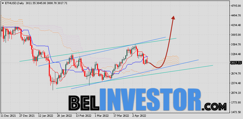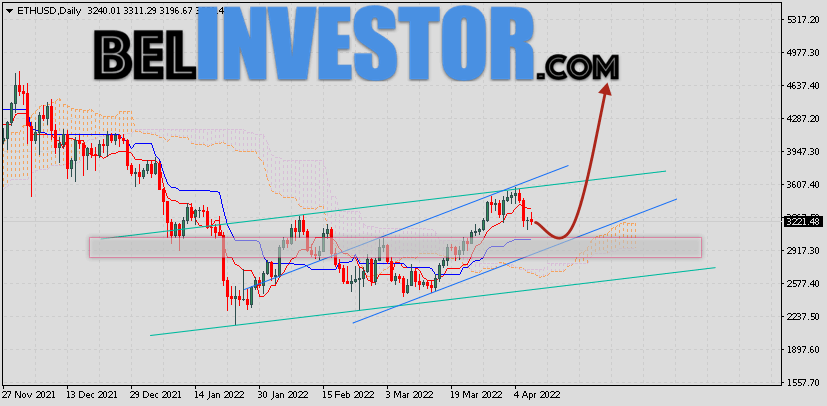 Криптовалюта Ethereum завершает торговую неделю вблизи области 3221. Котировки ETH/USD торгуются выше верхней границы Облака Ichimoku Kinko Hyo. Это указывает на наличие бычьей тенденции по Ethereum. В рамках прогноза курса цифрового актива на текущей неделе 11 — 15 апреля 2022. Ожидается тест сигнальных линий индикатора Ichimoku Kinko Hyo вблизи уровня 2995. Откуда стоит ожидать попытку отскока и продолжение роста криптовалюты с целью на уровне 4635. Ethereum прогноз курса на 11 — 15 апреля 2022 Дополнительным сигналом в пользу роста криптовалюты выступит тест уровня поддержки. Втор