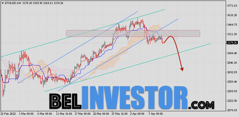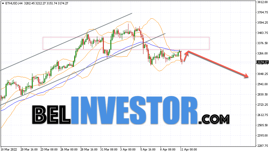 Ethereum ETH/USD торгуется на уровне 3174. Котировки криптовалюты торгуются ниже уровня скользящей средней с периодом 55. Это указывает на наличие медвежьей тенденции по Ethereum. На данный момент котировки криптовалюты движутся вблизи нижней границы полос индикатора Bollinger Bands. Ethereum ETH/USD прогноз на сегодня 12 апреля 2022 В рамках прогноза курса Ethereum ожидается тест уровня 3290. Откуда стоит ожидать попытку продолжения падения ETH/USD и дальнейшего развития нисходящей тенденции. Целью такого движения выступает область вблизи уровня 3000. Консервативная область для