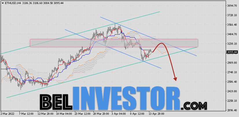 Ethereum ETH/USD торгуется на уровне 2989. Котировки криптовалюты торгуются ниже уровня скользящей средней с периодом 55. Это указывает на наличие медвежьей тенденции по Ethereum. На данный момент котировки криптовалюты движутся вблизи нижней границы полос индикатора Bollinger Bands. Ethereum ETH/USD прогноз на сегодня 13 апреля 2022 В рамках прогноза курса Ethereum ожидается тест уровня 3180. Откуда стоит ожидать попытку продолжения падения ETH/USD и дальнейшего развития нисходящей тенденции. Целью такого движения выступает область вблизи уровня 2850. Консервативная область для