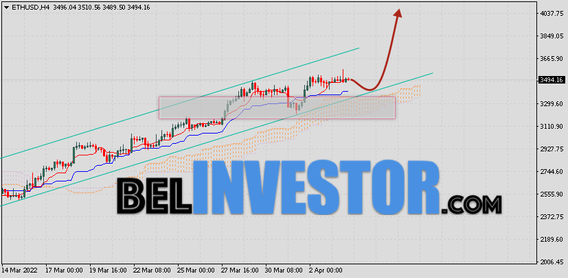 Криптовалюта Ethereum торгуется на уровне 3477 и продолжает движение в рамках роста и бычьего канала. Котировки ETH/USD движутся выше верхней границы Облака Ichimoku Kinko Hyo. Это указывает на наличие бычьей тенденции по Ethereum. В рамках прогноза курса Эфириум на 4 апреля 2022. Ожидается развитие снижения цифрового актива и тест сигнальных линий индикатора Ichimoku Kinko Hyo вблизи уровня 3355. Откуда стоит ожидать отскок и попытку продолжения роста ETH/USD с целью выше уровня 3865. ETH/USD прогноз и курс Ethereum на 4 апреля 2022 Дополнительным сигналом в пользу подъёма криптовалюты вы