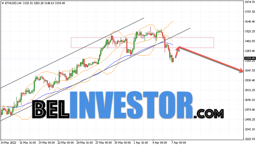 Ethereum ETH/USD торгуется на уровне 3195. Котировки криптовалюты торгуются ниже уровня скользящей средней с периодом 55. Это указывает на наличие медвежьей тенденции по Ethereum. На данный момент котировки криптовалюты движутся вблизи нижней границы полос индикатора Bollinger Bands. Ethereum ETH/USD прогноз на сегодня 8 апреля 2022 В рамках прогноза курса Ethereum ожидается тест уровня 3350. Откуда стоит ожидать попытку продолжения падения ETH/USD и дальнейшего развития нисходящей тенденции. Целью такого движения выступает область вблизи уровня 3040. Консервативная область для