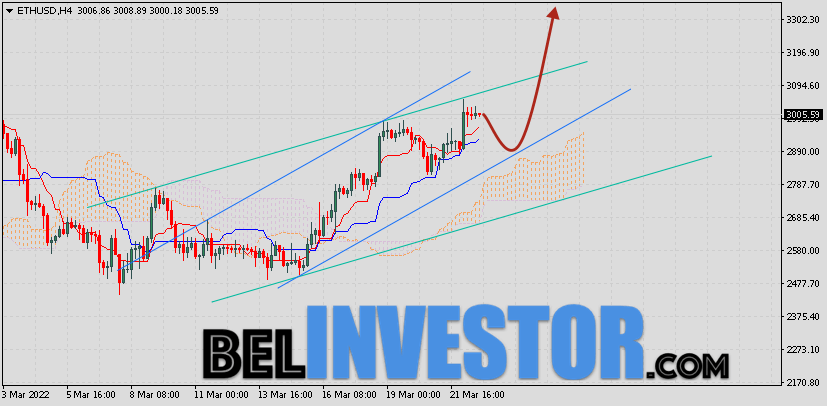 Криптовалюта Ethereum торгуется на уровне 3005 и продолжает движение в рамках роста и бычьего канала. Котировки ETH/USD движутся выше верхней границы Облака Ichimoku Kinko Hyo. Это указывает на наличие боковой тенденции по Ethereum. В рамках прогноза курса Эфириум на 23 марта 2022. Ожидается развитие снижения цифрового актива и тест сигнальных линий индикатора Ichimoku Kinko Hyo вблизи уровня 2890. Откуда стоит ожидать отскок и попытку продолжения роста ETH/USD с целью выше уровня 3405. ETH/USD прогноз и курс Ethereum на 23 марта 2022 Дополнительным сигналом в пользу подъёма криптовалюты вы