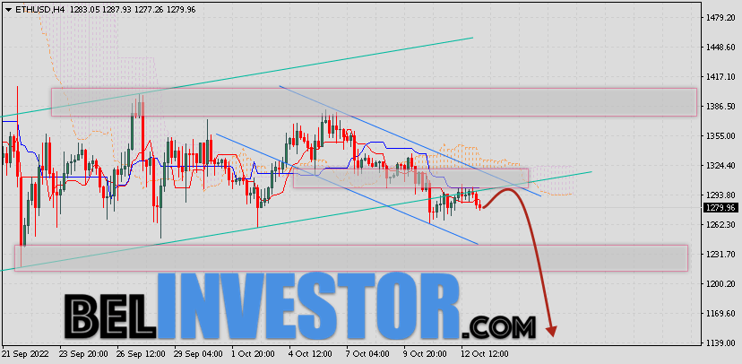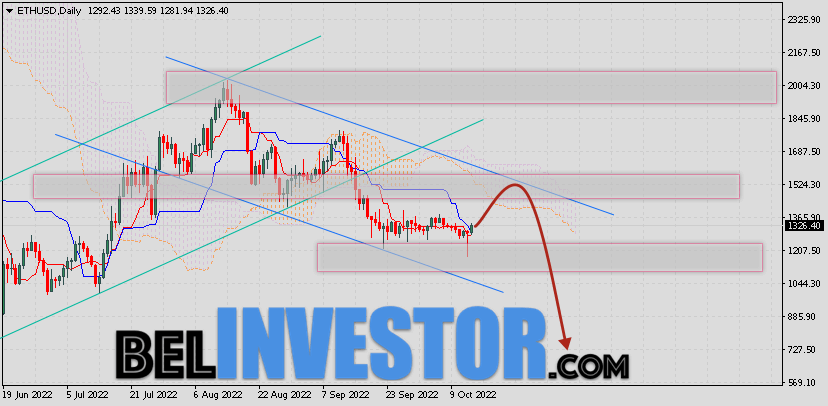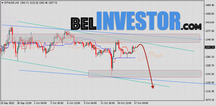 Криптовалюта Ethereum торгуется на уровне 1302 и продолжает движение в рамках коррекции и нисходящего канала. Котировки ETH/USD движутся ниже нижней границы Облака Ichimoku Kinko Hyo. Это указывает на наличие медвежьей тенденции по Ethereum. В рамках прогноза курса Эфириум на 13 октября 2022. Ожидается развитие коррекции цифрового актива и тест области сигнальных линий индикатора Ichimoku Kinko Hyo вблизи уровня 1335. Откуда стоит ожидать отскок и попытку продолжения падения ETH/USD с целью ниже уровня 1145. ETH/USD прогноз и курс Ethereum на 13 октября 2022 Дополнительным сигналом в польз