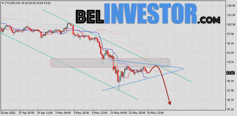 Криптовалюта Litecoin завершает торговую неделю вблизи области 68. Котировки LTC/USD торгуются ниже нижней границы Облака Ichimoku Kinko Hyo. Это указывает на наличие медвежьей тенденции по Litecoin. В рамках прогноза курса криптовалюты на следующую неделю 16 — 20 мая 2022. Ожидается попытка развития коррекции цены и тест области сигнальных линий индикатора Ишимоку вблизи уровня 75. Откуда стоит ожидать отскок вниз и попытку продолжения падения LTC/USD с потенциальной целью ниже уровня 10. Курс Litecoin прогноз на 16 — 20 мая 2022 Дополнительным сигналом в пользу падения крип