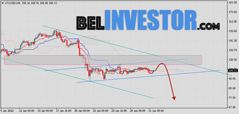Криптовалюта Litecoin завершает торговую неделю вблизи области 107. Котировки LTC/USD торгуются ниже нижней границы Облака Ichimoku Kinko Hyo. Это указывает на наличие медвежьей тенденции по Litecoin. В рамках прогноза курса криптовалюты на следующую неделю 31 января — 4 февраля 2022. Ожидается попытка развития коррекции цены и тест нижней границы Облака индикатора Ишимоку вблизи уровня 125. Откуда стоит ожидать отскок вниз и попытку падения LTC/USD с потенциальной целью ниже уровня 45. Курс Litecoin прогноз на 31 января — 4 февраля 2022 Дополнительным сигналом в пользу паден