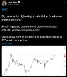 В течение 2020 года Bitcoin (BTC) ушел с $10 000 до $3 800, а затем поднялся выше $15 500. Несмотря на кризис КОВИД-19, это был хороший год для Bitcoin. Сейчас, когда мы приближаемся к концу года, аналитики продолжают делиться своими прогнозами развития рынка. Джош Рейгер, например, считает, что Bitcoin может подняться до $17,000. Достигнет ли Биткойн $17,000? По мнению криптоаналитика и соучредителя Blockroots Джоша Рейгера, в ближайшем будущем может произойти большой прорыв в развитии Bitcoin. В недавнем твиттере он поделился графиком Bitcoin и заявил, что если Bitcoin закроется выше $16,200, то